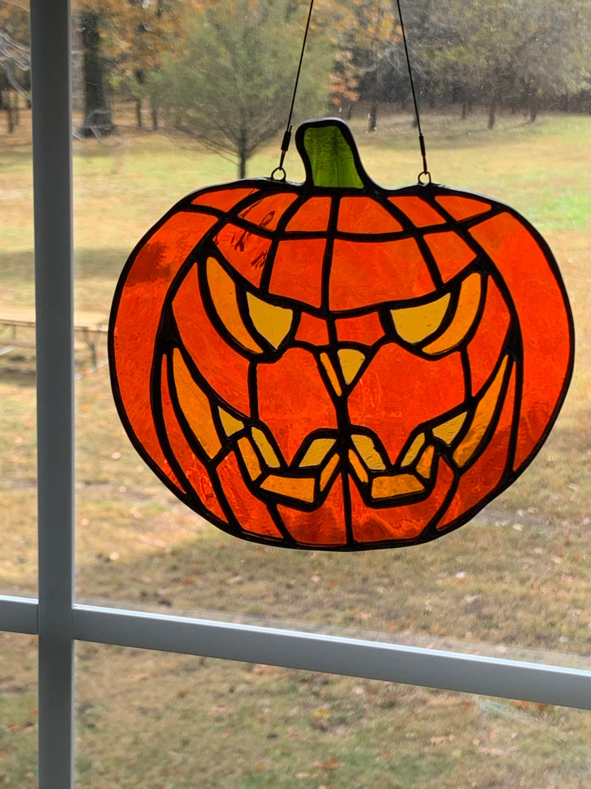 This pattern looks so perfect for spooky season, however whoever made it doesn’t have experience in stained glass. There are lots of right angles and sharp corners were are impossible to cut and even more impossible to grind. I did my best with the pattern and the top half worked pretty good, but those fangs and the bottom half are a nightmare (pun intended).