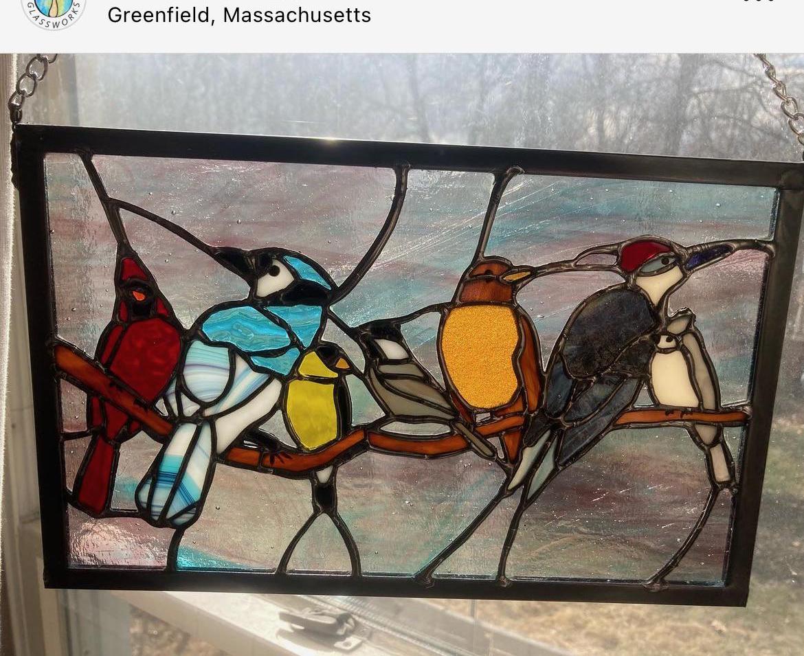 The birds are cardinal, bluejay, goldfinch, sparrow, robin, woodpecker, titmouse.